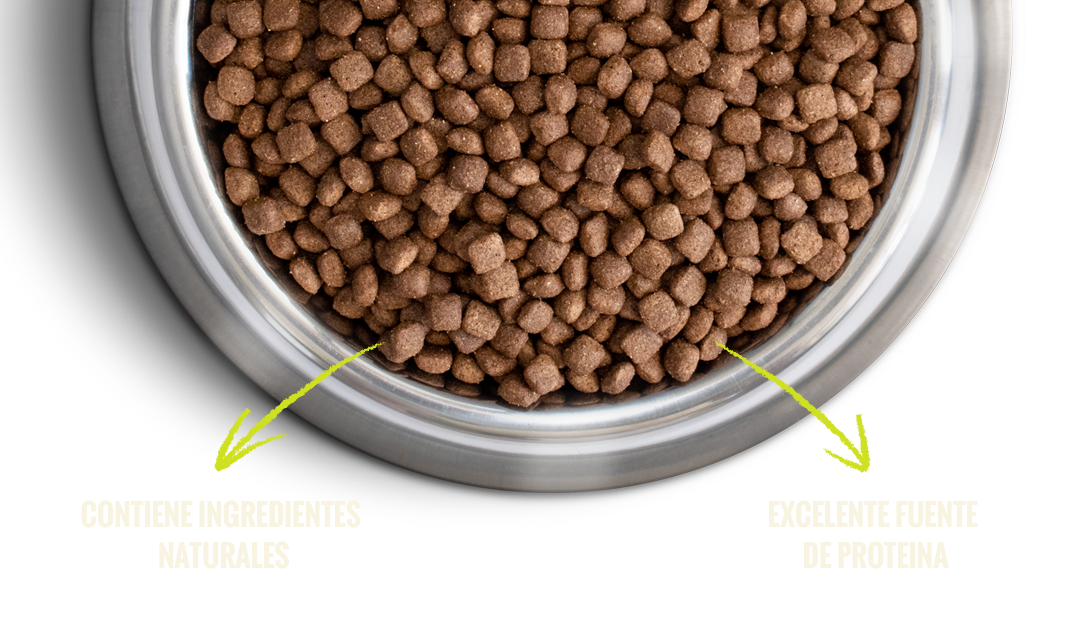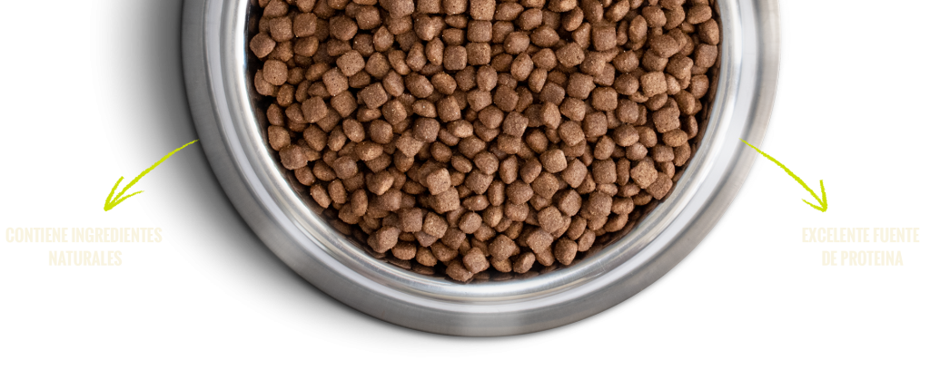 Harina de carne y hueso (bovino, cerdo y/o ave), arroz, maíz, salvado de trigo, harina de soya, aceite de ave, cerdo y/o vacuno, gluten meal, hidrolizado de hígado (vacuno, ave y/o cerdo), coseta de remolacha, colorante caramelo natural, aceite de origen marino (fuente de Omega 3), sal, zeolita, cultivo de levaduras, hexametafosfato de sodio, extracto de quillay, extracto seco de maqui, post-biótico, MOS (manano-oligosacáridos), zinc orgánico, antioxidante natural (extracto de romero y tocoferoles).